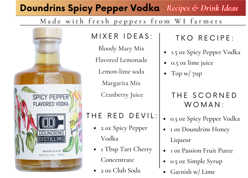 Doundrins Spicy Pepper Vodka is made and flavored with a freshly harvested blend of sweet and spicy peppers that come from an array of local farms all within 1 hour of the distillery. It has a strong pepper aroma and balanced flavor that is spicy, but not too spicy. The vegetal taste of the peppers and even the citrus notes of some of the chilis shines through. The combination of both sweet and spicy peppers gives it the heat you crave with the flavor you want. It is great in a bloody mary or as an addition to a margarita. If you are looking for a new way to get your spice on try it in our “Flaming Black Cherry” or “TKO”. The “TKO” is only 3 ingredients: lime juice, Doundrins Spicy Pepper Vodka, and lemon-lime soda.